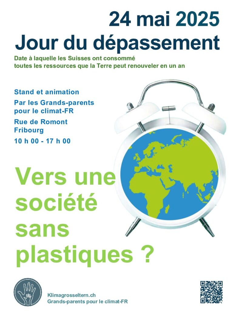 C’est autour du 24 mai que la Suisse aura épuisé l’entièreté des ressources que la Terre peut renouveler pour notre pays en un an. Les Grands-parents pour le climat tiendront un stand ce jour-là à la Rue de Romont à Fribourg de 10.00 à 17.00 heures. Nous espérons aussi pouvoir tenir un stand à Bulle. Nous avons encore besoin de quelques bénévoles pour tenir le stand une heure ou plus. Les personnes intéressées peuvent s’adresser à Cristina (tclt@bluewin.ch).