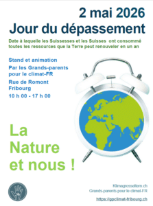 En 2026, ce jour du dépassement aura lieu le lundi 11 mai, mais nous allons organiser notre traditionnel rendez-vous à la rue de Romont à Fribourg, le samedi 2 mai 2026, avec stand, jeux, poésies, récits, etc. Le thème portera sur nos connexions à la nature, une manière de vivre la sobriété.